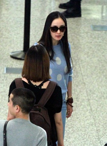前楊冪現身上海機場,當天她身穿一件藍白波點上衣現身,頗似奶牛裝。