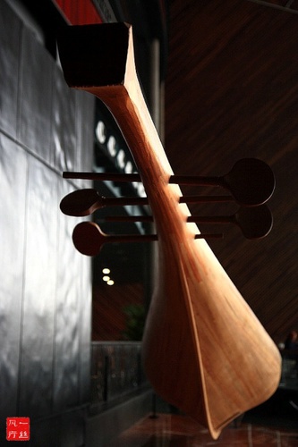 梦舟俯览如橄榄叶,仰视又如中国古典乐器琵琶,瓦盖里斯将它赠给中国国家大剧院,现在停放在戏剧厅外。上面刻的中文就是雕塑家请罗彤书写、再按墨迹刻出来的。