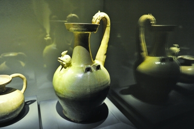 鸡首壶是六朝博物馆展出众多文物中的臻品之一。在展厅一层、二层,游客能看到从南京雨花台等地区的六朝墓葬中出土的鸡首壶,它们大小不一,造型基本趋于一致:它在“盘口壶”的基础上,壶身一侧贴有鸡首,另一侧带有把手。专家介绍,鸡首壶是六朝青瓷中的典型,其用途有酒器、茶具之说,也有专门用于陪葬的明器之说。文物界认为,这种器型的出现,改变了原先壶、罐没有流口,倾倒不便的状况,是最早的执壶——手持壶身上的把手,稍稍倾斜壶身,水就从壶嘴中流出来了。