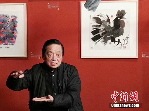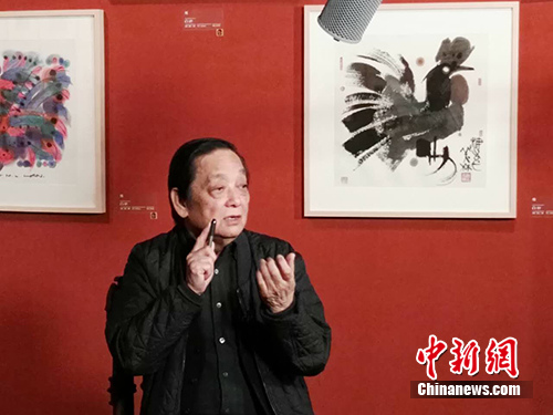 韩美林现场讲述《丁酉年》生肖邮票邮品创作故事。中新网记者 宋宇晟 摄