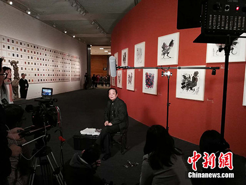 本次采访的地点在中国国家博物馆“美林的世界 韩美林八十大展”的现场。恰逢2017农历丁酉年来临之际,展厅内展出了韩美林创作的百余幅以鸡为主题的画作。